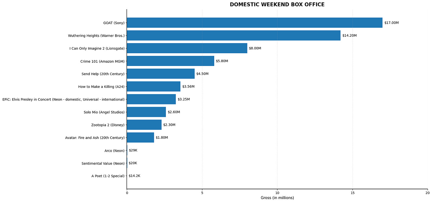 Sony’s GOAT took #1 at the box office with $17M domestic. This brings its domestic total to $58.3M. Its worldwide total is $102.3M.