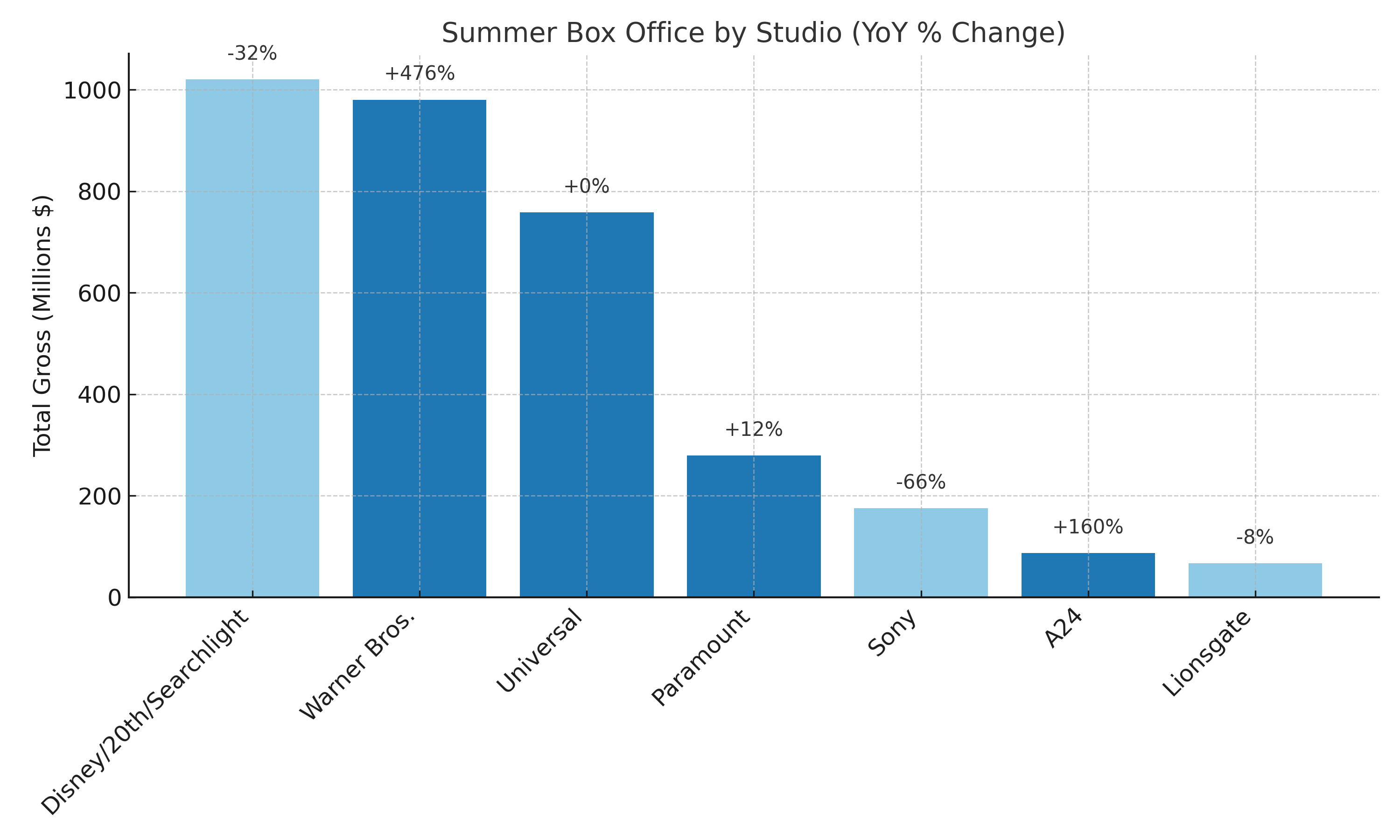 The silver lining was that Warner Bros. bet big on originals, and they 5x’d what they’d made in 2024. Here’s the breakdown by studio and the gain/drop from last summer: